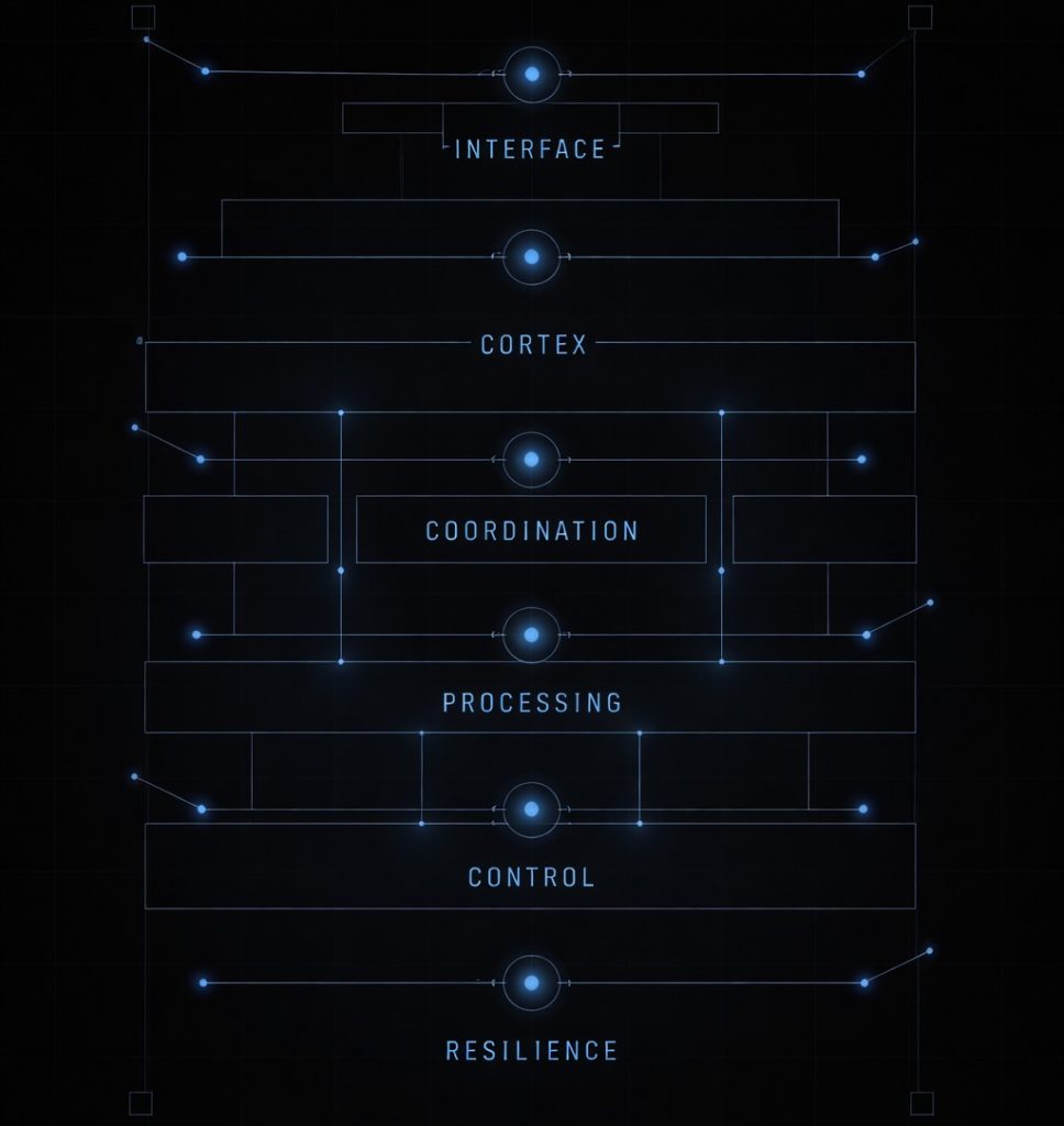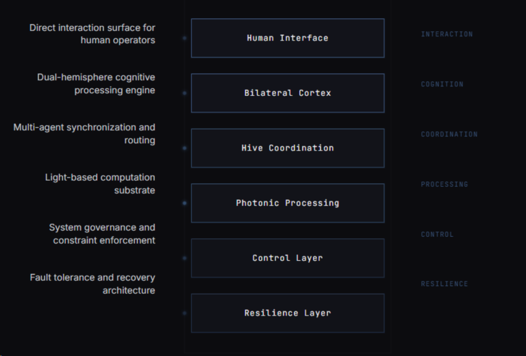 Built on coordinated AI systems, photonic processing foundations, and bilateral cognitive architectures.